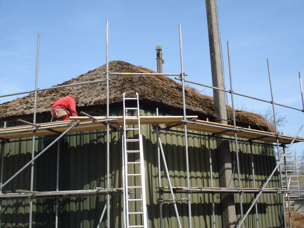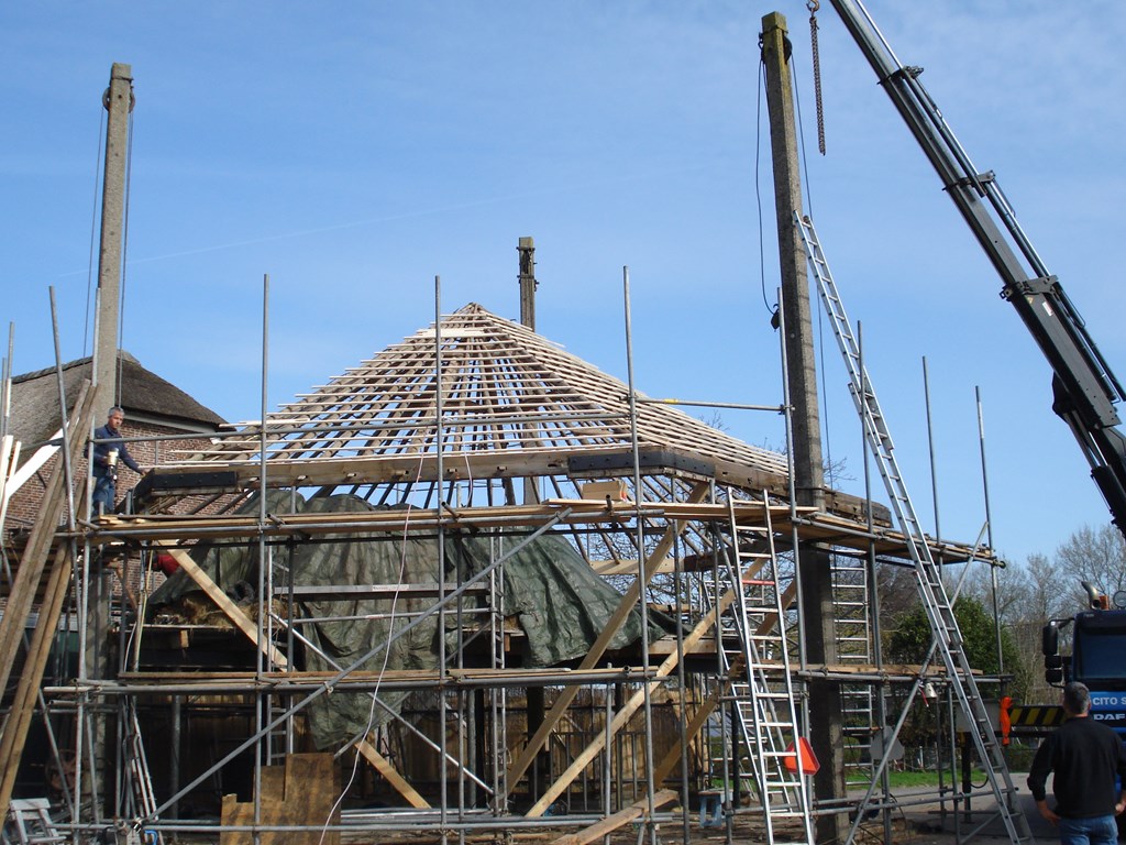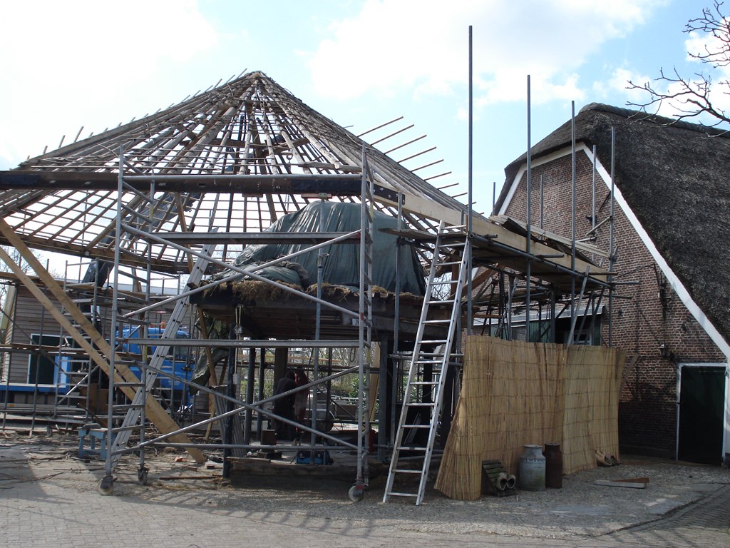 De oude hooiberg is volledig gerenoveerd met behoud van de oude sporenkap. De betonnen roeden zijn verwijderd en de hooiberg is voorzien van een nieuwe rietgedekte kap. De wanden bestaan uit een gemetselde borstwering met daarop houtskeletwanden welke zijn afgewerkt met potdeksel-delen. Dit geeft de hooiberg een authentieke uitstraling. De raamkozijnen zijn voorzien van een kruis-roedeverdeling. De hard houten opgeklampte deuren zijn vervaardigd in eigen werkplaats.