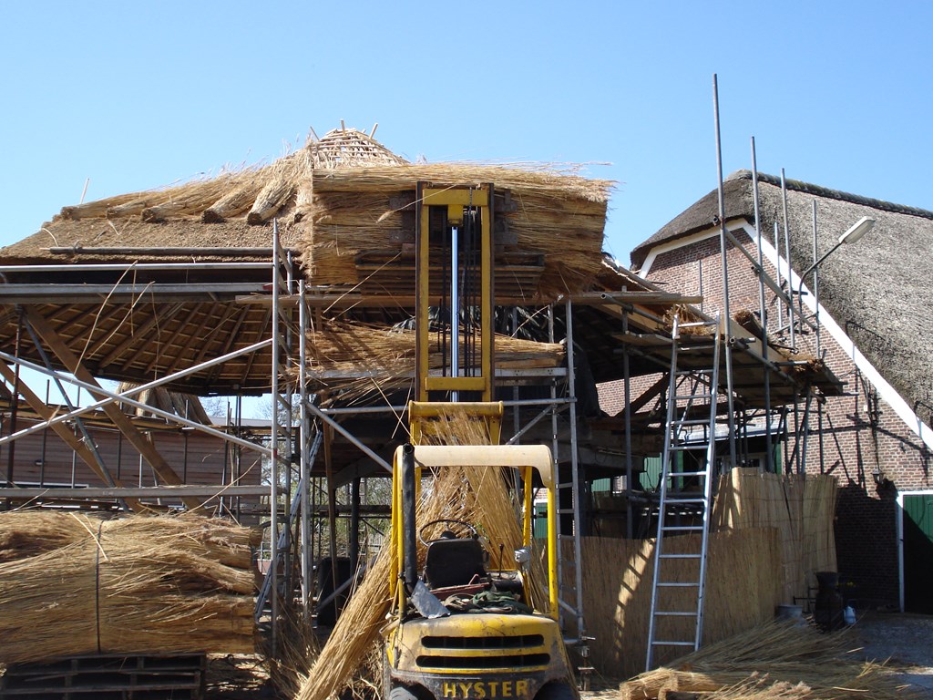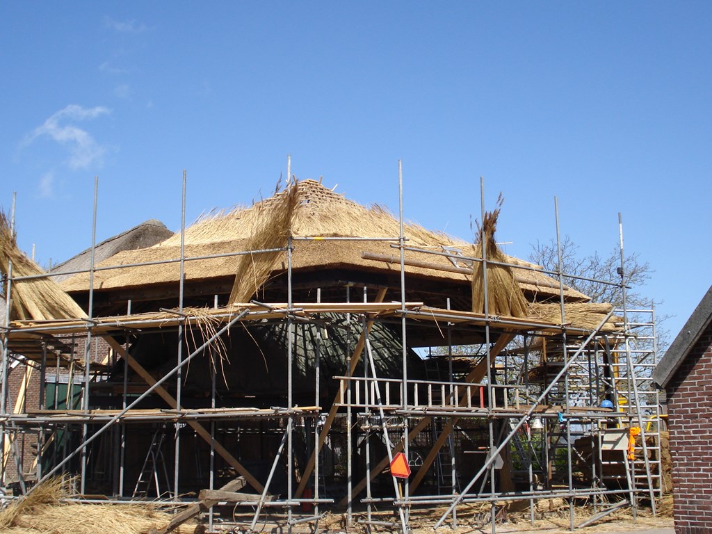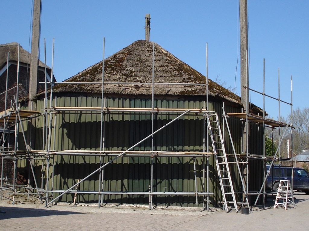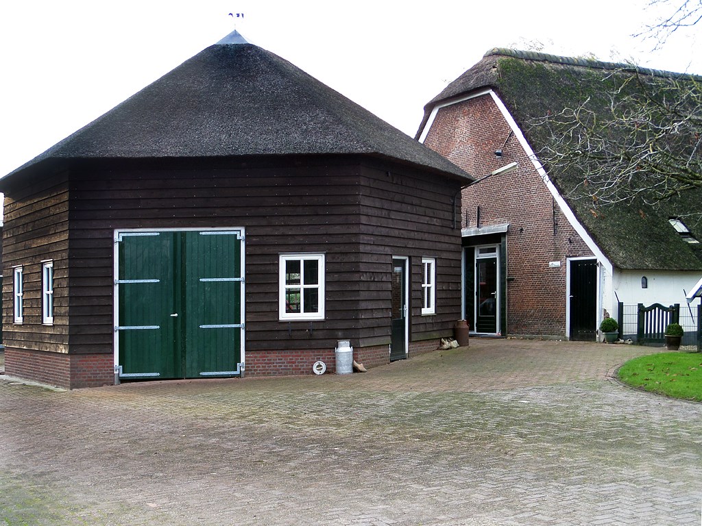 De oude hooiberg is volledig gerenoveerd met behoud van de oude sporenkap. De betonnen roeden zijn verwijderd en de hooiberg is voorzien van een nieuwe rietgedekte kap. De wanden bestaan uit een gemetselde borstwering met daarop houtskeletwanden welke zijn afgewerkt met potdeksel-delen. Dit geeft de hooiberg een authentieke uitstraling. De raamkozijnen zijn voorzien van een kruis-roedeverdeling. De hard houten opgeklampte deuren zijn vervaardigd in eigen werkplaats.