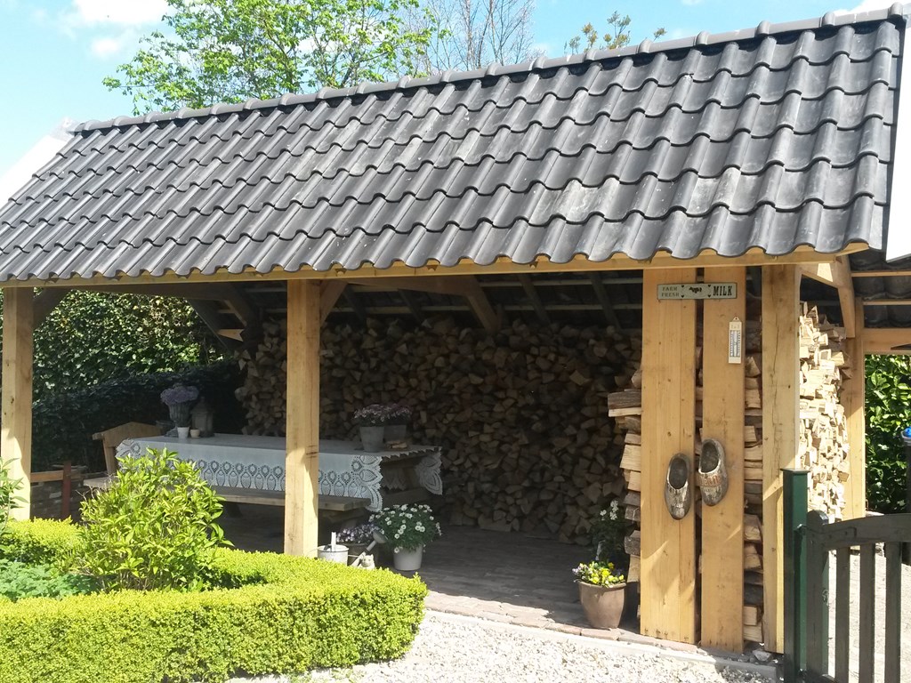 Deze tuinkamer is een combinatie van een houtopslag en een heerlijk plekje om het gehele jaar van het buitenleven te kunnen genieten.